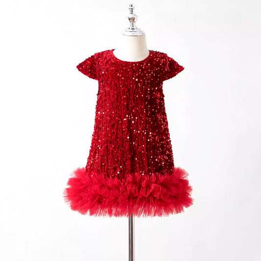 Toddler Girl Christmas Red Dress - Sparkle Sequin & Fluffy Tulle Ruffles