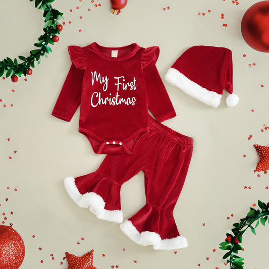 My First Christmas Baby Girl Outfit with Red Velvet Bell Bottoms & Santa Hat