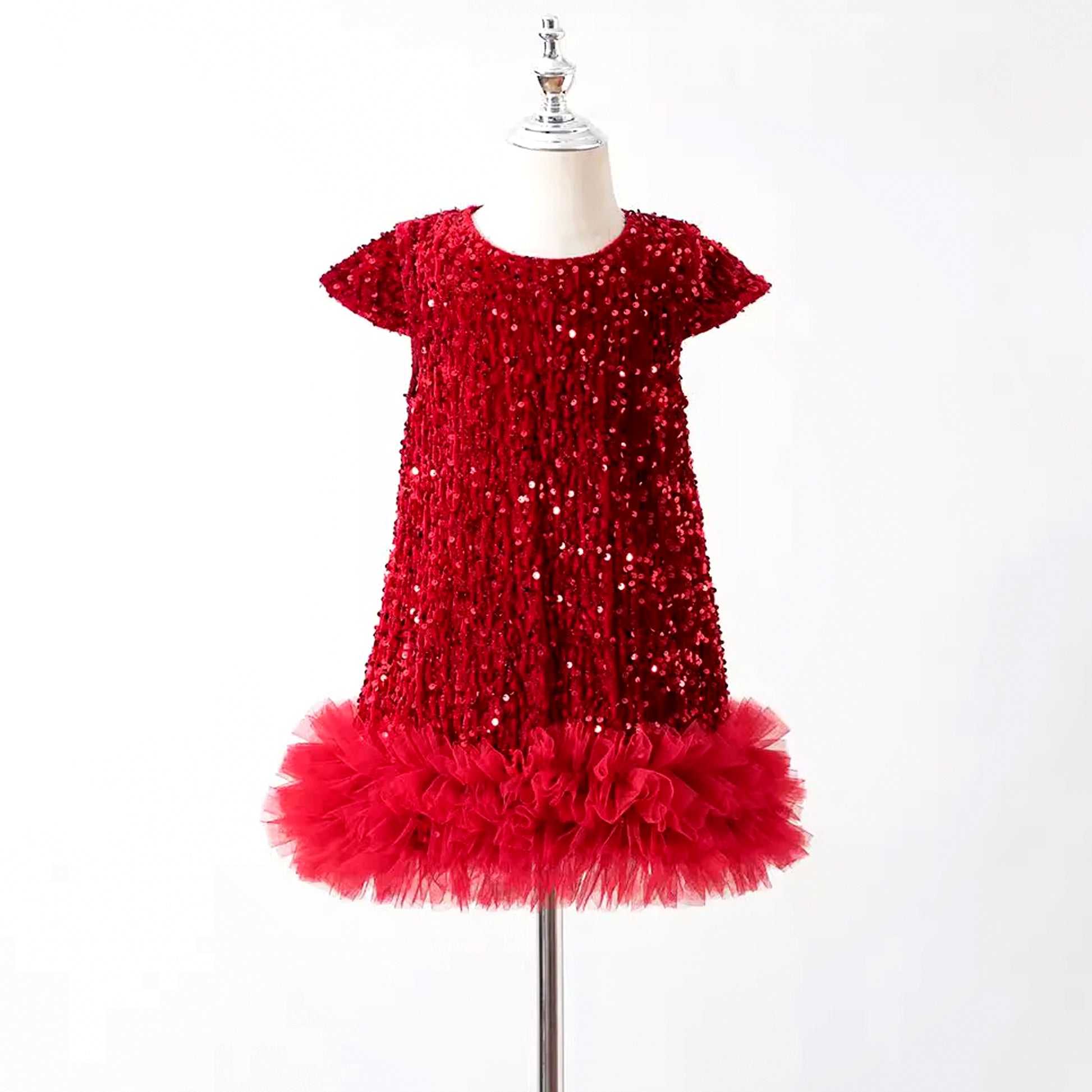 Toddler Girl Christmas Party Dress: Red Velvet Sparkle Sequin Gown with Fluffy Tulle Ruffles, Holiday Kids Outfit for Special Occasion